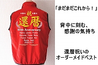 これぞ世界で一つだけの還暦ベスト!という刺繍をオリジナルで作製可能です。刺繍はプリントとは違う立体感、光沢感があり、仕上がりの高級感が違います。入れる内容は自由に決められます。サンプルの赤ベストは大きく祝・還暦と入れて贈り主である長男、長女、次男さまのお名前を入れてその下にお孫さんたちのお名前を入れさせていただきました。皆さんの想いが載せられた世界で一つだけの還暦ベストとなりました。こちらの仕上がりで税込¥10,000となります。刺繍する内容やレイアウトが決定してから発送まで5日ほど頂戴致します。手書きのラフ画を当店の公式ラインかメールで送っていただければ見積もりをお出し致します。